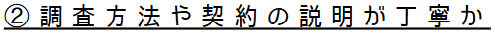 調査の流れ、調査員の人数、使用機材などについて、詳しく説明があるか確認しましょう。