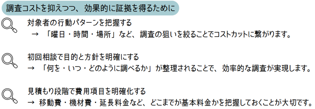 ですが、事前準備と正しい依頼の仕方次第で、費用を抑えながら効果的な調査を行うことは十分に可能です。